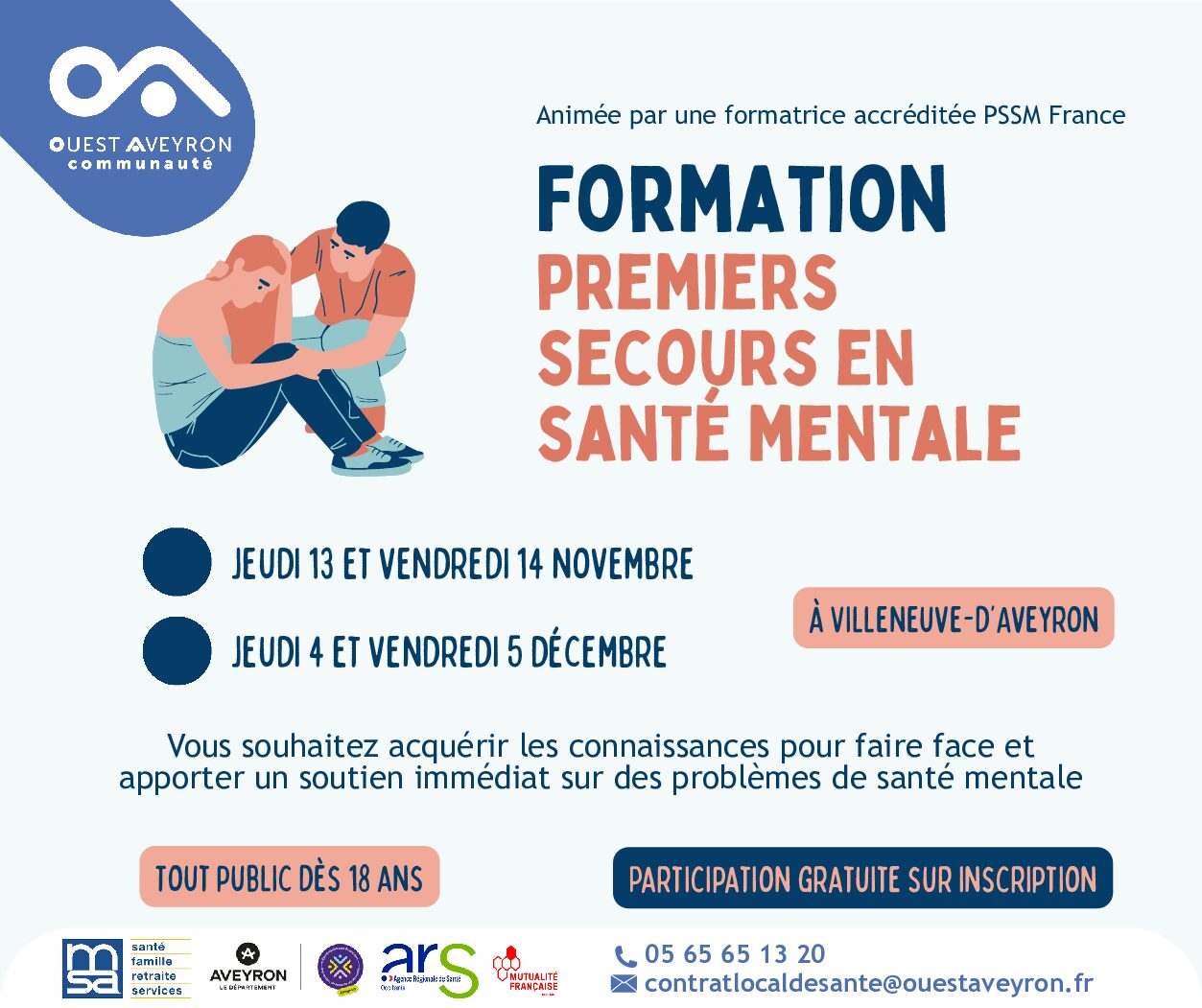 Dans le cadre du Contrat Local de Santé (CLS), Ouest Aveyron Communauté propose, fin 2025, deux sessions de formation aux Premiers Secours en Santé Mentale (PSSM) à Villeneuve-d’Aveyron, de 9 h à 17 h 30, avec repas organisés. Les rendez-vous :